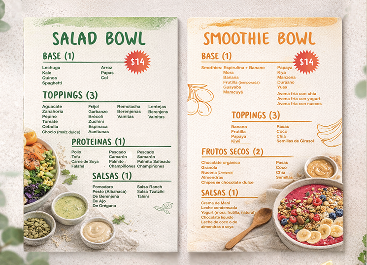 A clean, vibrant menu design, highlighting customizable salad and smoothie bowls inspired by fresh, local ingredients.